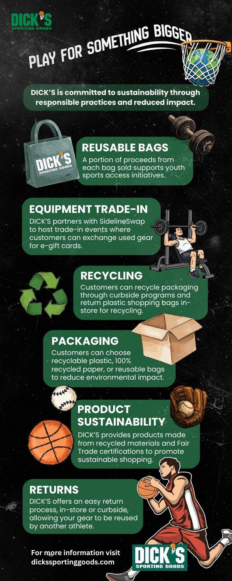 This infographic highlights DICK’S Sporting Goods’ sustainability efforts while staying true to the brand’s strong connection to sports.